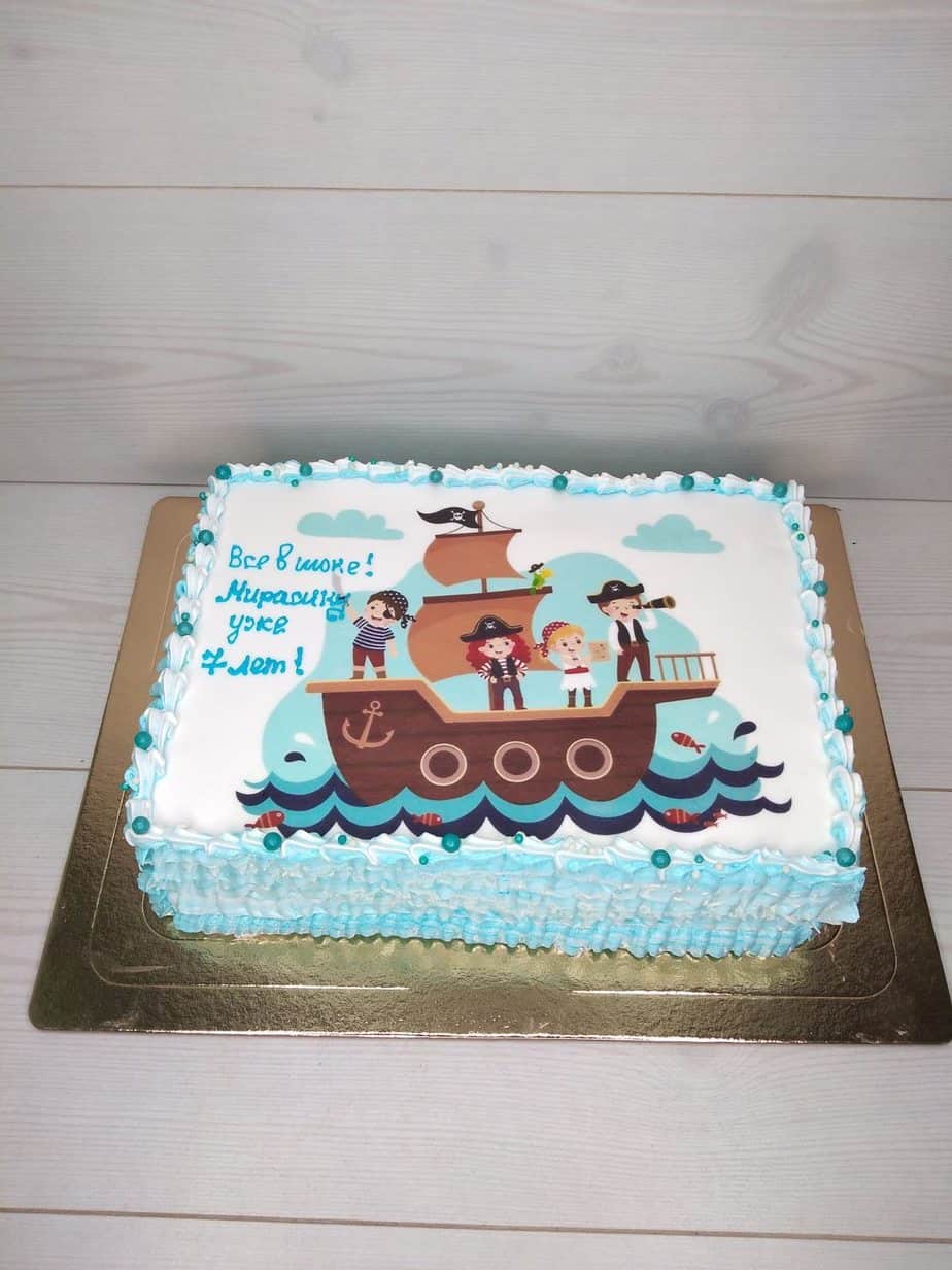 Детский торт изготовлен на заказ. Снаружи одноярусный торт покрыт кремом, без мастики и украшен фотопечатью корабля. Наполнитель может быть с белковым кремом, с кремом на растительных сливках, с масляным кремом, с творожным кремом, с шоколадным кремом, со сливочно-творожным кремом, со сливочным кремом, со сметанным кремом . Коржи могут быть бисквитные, медовые, песочные, шоколадные. Заказать, купить готовый детский торт на день рождения ребенка по низкой цене в кондитерской Добрый пекарь ☎ + 375 44 700 40 15.