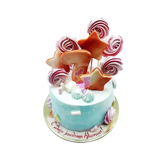 Детский торт изготовлен на заказ. Вес такого торта от 2 до 4 кг . Снаружи одноярусный торт покрыт кремом, без мастики и украшен безе, украшен пряниками . Наполнитель может быть с белковым кремом, с кремом на растительных сливках, с масляным кремом, с творожным кремом, с шоколадным кремом, со сливочно-творожным кремом, со сливочным кремом, со сметанным кремом . Коржи могут быть бисквитные, медовые, песочные, шоколадные. Цена от 98 р. Заказать, купить готовый детский торт на день рождения ребенка по низкой цене в кондитерской Добрый пекарь ☎ + 375 44 700 40 15.