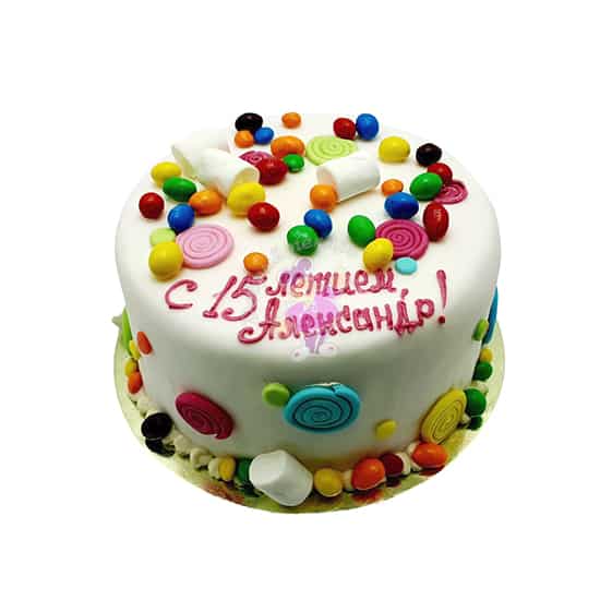 Детский торт изготовлен на заказ. Вес такого торта от 2 до 4 кг . Снаружи одноярусный торт покрыт мастикой и украшен конфетами . Наполнитель может быть с белковым кремом, с кремом на растительных сливках, с масляным кремом, с шоколадным кремом, со сливочным кремом, со сметанным кремом . Коржи могут быть бисквитные, медовые, песочные, шоколадные. Цена от 105 р. Заказать, купить готовый детский торт на день рождения ребенка по низкой цене в кондитерской Добрый пекарь ☎ + 375 44 700 40 15.