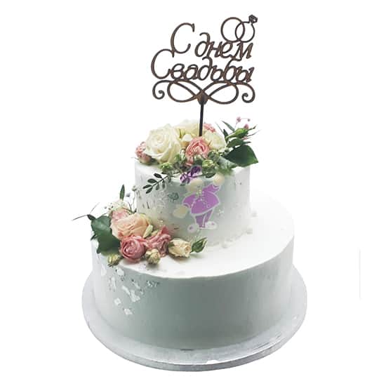 Свадебный торт изготовлен на заказ. Вес такого торта от 3 до 5 кг . Снаружи двухъярусный торт покрыт кремом, без мастики и украшен цветами, украшен топперами . Наполнитель может быть с белковым кремом, с кремом на растительных сливках, с масляным кремом, с творожным кремом, с шоколадным кремом, со сливочно-творожным кремом, со сливочным кремом, со сметанным кремом . Белый торт . Коржи могут быть бисквитные, медовые, песочные, шоколадные. Цена от 167 р. Заказать, купить готовый торт на свадьбу по низкой цене в кондитерской Добрый пекарь ☎ + 375 44 700 40 15