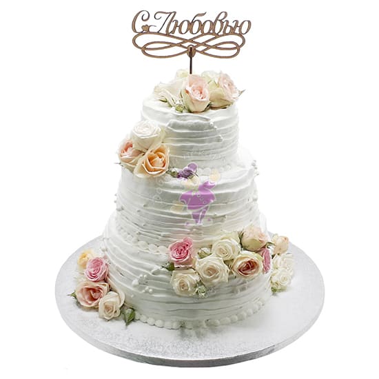 Свадебный торт изготовлен на заказ. Вес такого торта от 5 до 8 кг . Снаружи трехъярусный торт покрыт кремом, без мастики и украшен цветами, украшен топперами . Наполнитель может быть с белковым кремом, с кремом на растительных сливках, с масляным кремом, с творожным кремом, с шоколадным кремом, со сливочно-творожным кремом, со сливочным кремом, со сметанным кремом . Белый торт . Коржи могут быть бисквитные, медовые, песочные, шоколадные. Цена от 250 р. Заказать, купить готовый торт на свадьбу по низкой цене в кондитерской Добрый пекарь ☎ + 375 44 700 40 15