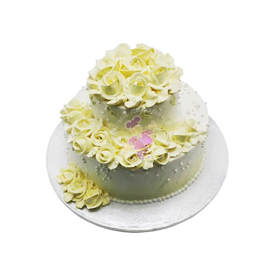 Свадебный торт изготовлен на заказ. Вес такого торта от 3 до 5 кг . Снаружи двухъярусный торт покрыт кремом, без мастики и украшен цветами . Наполнитель может быть с белковым кремом, с кремом на растительных сливках, с масляным кремом, с творожным кремом, с шоколадным кремом, со сливочно-творожным кремом, со сливочным кремом, со сметанным кремом . Желтый торт . Коржи могут быть бисквитные, медовые, песочные, шоколадные. Цена от 160 р. Заказать, купить готовый торт на свадьбу по низкой цене в кондитерской Добрый пекарь ☎ + 375 44 700 40 15