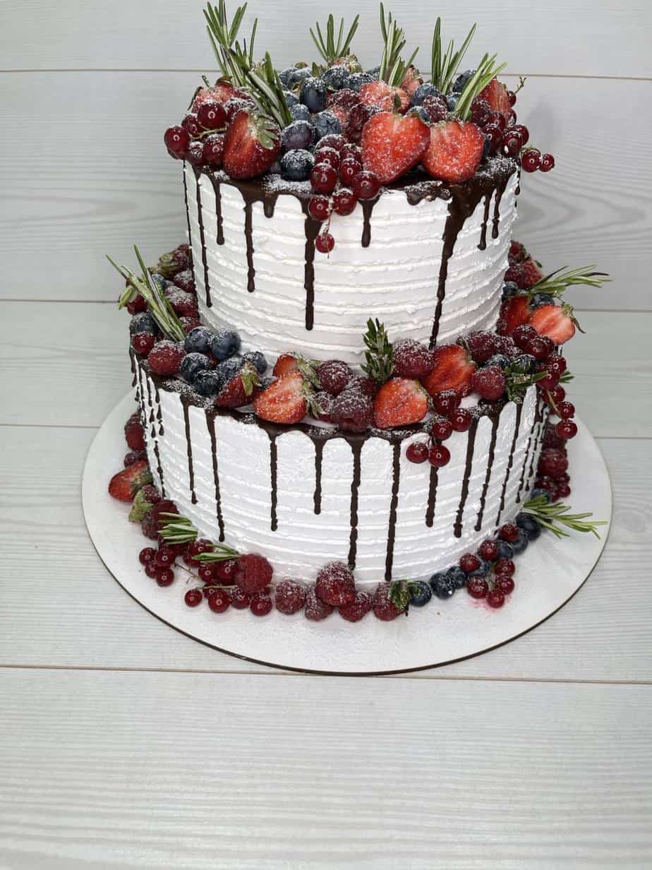 Свадебный торт изготовлен на заказ. Снаружи двухъярусный торт покрыт кремом, без мастики и украшен свежими фруктами. Наполнитель может быть с белковым кремом, с кремом на растительных сливках, с масляным кремом, с творожным кремом, с шоколадным кремом, со сливочно-творожным кремом, со сливочным кремом, со сметанным кремом. Заказать, купить готовый торт на свадьбу по низкой цене в кондитерской Добрый пекарь ☎ + 375 44 700 40 15