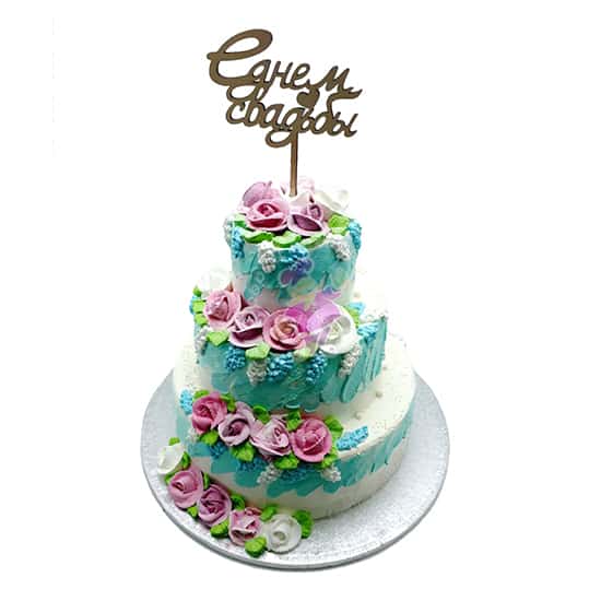 Свадебный торт изготовлен на заказ. Вес такого торта от 5 до 8 кг . Снаружи трехъярусный торт покрыт мастикой и украшен цветами, украшен топперами . Наполнитель может быть с белковым кремом, с кремом на растительных сливках, с масляным кремом, с шоколадным кремом, со сливочным кремом, со сметанным кремом . Бежевый торт, Бирюзовый торт . Коржи могут быть бисквитные, медовые, песочные, шоколадные. Цена от 199 р. Заказать, купить готовый торт на свадьбу по низкой цене в кондитерской Добрый пекарь ☎ + 375 44 700 40 15