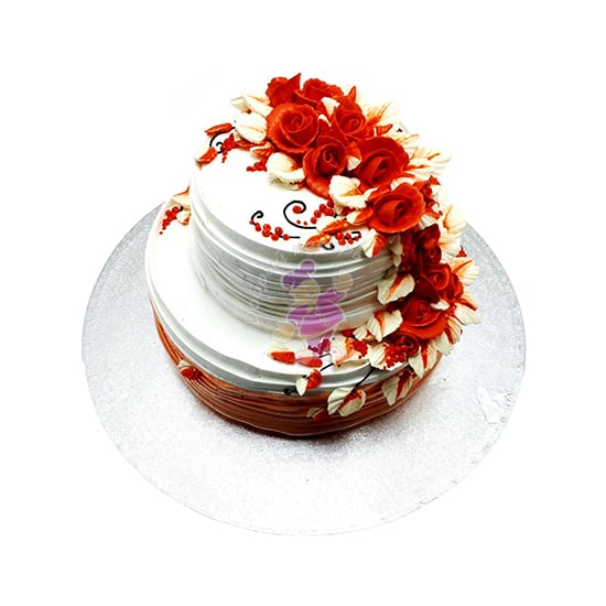 Свадебный торт изготовлен на заказ. Вес такого торта от 3 до 5 кг . Снаружи двухъярусный торт покрыт мастикой и украшен цветами . Наполнитель может быть с белковым кремом, с кремом на растительных сливках, с масляным кремом, с шоколадным кремом, со сливочным кремом, со сметанным кремом . Белый торт, Красный торт . Коржи могут быть бисквитные, медовые, песочные, шоколадные. Цена от 144 р. Заказать, купить готовый торт на свадьбу по низкой цене в кондитерской Добрый пекарь ☎ + 375 44 700 40 15