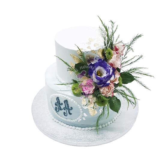 Свадебный торт изготовлен на заказ. Вес такого торта от 3 до 5 кг . Снаружи двухъярусный торт покрыт кремом, без мастики и украшен цветами . Наполнитель может быть с белковым кремом, с кремом на растительных сливках, с масляным кремом, с творожным кремом, с шоколадным кремом, со сливочно-творожным кремом, со сливочным кремом, со сметанным кремом . Белый торт . Коржи могут быть бисквитные, медовые, песочные, шоколадные. Цена от 136 р. Заказать, купить готовый торт на свадьбу по низкой цене в кондитерской Добрый пекарь ☎ + 375 44 700 40 15