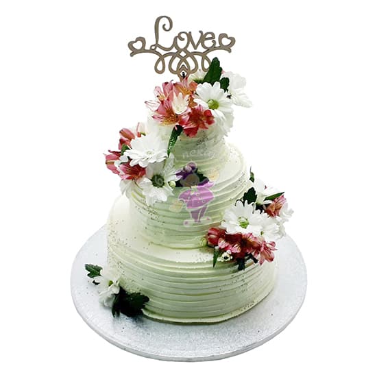 Свадебный торт изготовлен на заказ. Вес такого торта от 5 до 8 кг . Снаружи трехъярусный торт покрыт кремом, без мастики и украшен цветами, украшен топперами . Наполнитель может быть с белковым кремом, с кремом на растительных сливках, с масляным кремом, с творожным кремом, с шоколадным кремом, со сливочно-творожным кремом, со сливочным кремом, со сметанным кремом . Белый торт . Коржи могут быть бисквитные, медовые, песочные, шоколадные. Цена от 178 р. Заказать, купить готовый торт на свадьбу по низкой цене в кондитерской Добрый пекарь ☎ + 375 44 700 40 15