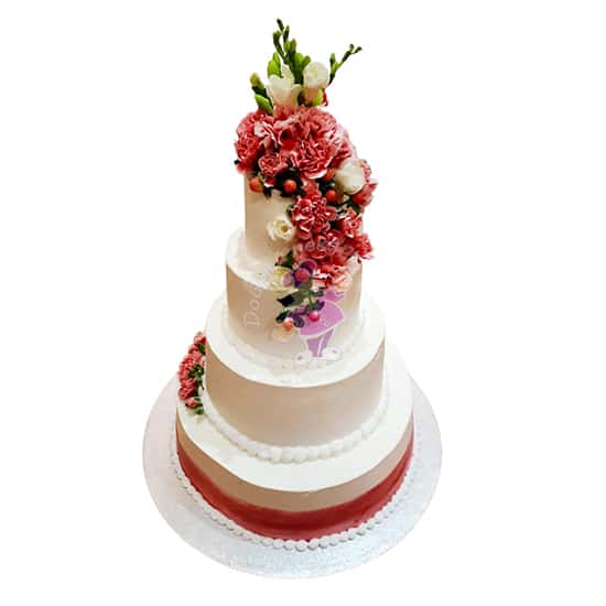 Свадебный торт изготовлен на заказ. Вес такого торта от 8 до 12 кг . Снаружи четырехъярусный торт покрыт кремом, без мастики и украшен цветами . Наполнитель может быть с белковым кремом, с кремом на растительных сливках, с масляным кремом, с творожным кремом, с шоколадным кремом, со сливочно-творожным кремом, со сливочным кремом, со сметанным кремом . Белый торт . Коржи могут быть бисквитные, медовые, песочные, шоколадные. Цена от 330 р. Заказать, купить готовый торт на свадьбу по низкой цене в кондитерской Добрый пекарь ☎ + 375 44 700 40 15