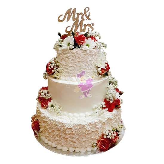 Свадебный торт изготовлен на заказ. Вес такого торта от 5 до 8 кг . Снаружи трехъярусный торт покрыт кремом, без мастики и украшен цветами, украшен топперами . Наполнитель может быть с белковым кремом, с кремом на растительных сливках, с масляным кремом, с творожным кремом, с шоколадным кремом, со сливочно-творожным кремом, со сливочным кремом, со сметанным кремом . Белый торт . Коржи могут быть бисквитные, медовые, песочные, шоколадные. Цена от 198 р. Заказать, купить готовый торт на свадьбу по низкой цене в кондитерской Добрый пекарь ☎ + 375 44 700 40 15