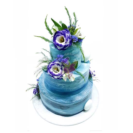 Свадебный торт изготовлен на заказ. Вес такого торта от 5 до 8 кг . Снаружи трехъярусный торт покрыт мастикой и украшен цветами . Наполнитель может быть с белковым кремом, с кремом на растительных сливках, с масляным кремом, с шоколадным кремом, со сливочным кремом, со сметанным кремом . Синий торт . Коржи могут быть бисквитные, медовые, песочные, шоколадные. Цена от 173 р. Заказать, купить готовый торт на свадьбу по низкой цене в кондитерской Добрый пекарь ☎ + 375 44 700 40 15