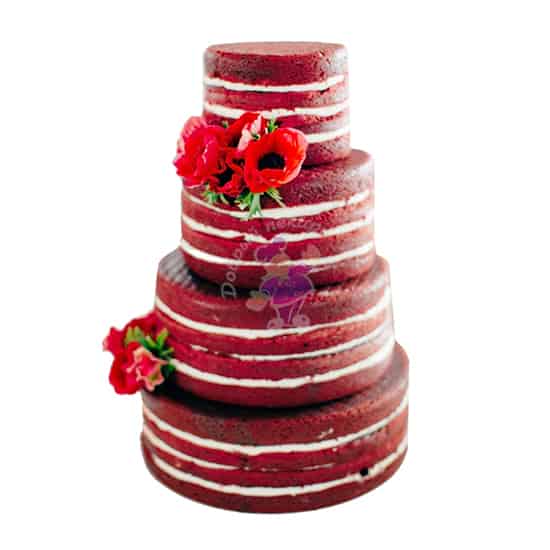 Свадебный торт изготовлен на заказ. Вес такого торта от 8 до 12 кг . Снаружи четырехъярусный торт голый, без мастики и украшен цветами . Наполнитель может быть с белковым кремом, с кремом на растительных сливках, с масляным кремом, с творожным кремом, с шоколадным кремом, со сливочно-творожным кремом, со сливочным кремом, со сметанным кремом . Красный торт . Коржи могут быть бисквитные, медовые, песочные, шоколадные. Цена от 317 р. Заказать, купить готовый торт на свадьбу по низкой цене в кондитерской Добрый пекарь ☎ + 375 44 700 40 15