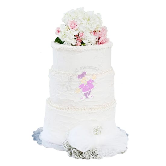 Свадебный торт изготовлен на заказ. Вес такого торта от 5 до 8 кг . Снаружи трехъярусный торт покрыт кремом, без мастики и украшен цветами, украшен художественной росписью . Наполнитель может быть с белковым кремом, с кремом на растительных сливках, с масляным кремом, с творожным кремом, с шоколадным кремом, со сливочно-творожным кремом, со сливочным кремом, со сметанным кремом . Белый торт . Коржи могут быть бисквитные, медовые, песочные, шоколадные. Цена от 224 р. Заказать, купить готовый торт на свадьбу по низкой цене в кондитерской Добрый пекарь ☎ + 375 44 700 40 15