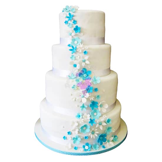 Свадебный торт изготовлен на заказ. Вес такого торта от 8 до 12 кг . Снаружи четырехъярусный торт покрыт мастикой и украшен цветами, украшен художественной росписью . Наполнитель может быть с белковым кремом, с кремом на растительных сливках, с масляным кремом, с шоколадным кремом, со сливочным кремом, со сметанным кремом . Белый торт . Коржи могут быть бисквитные, медовые, песочные, шоколадные. Цена от 324 р. Заказать, купить готовый торт на свадьбу по низкой цене в кондитерской Добрый пекарь ☎ + 375 44 700 40 15