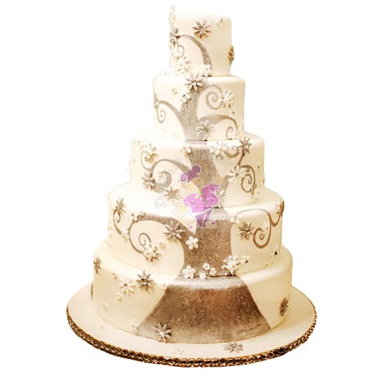 Свадебный торт изготовлен на заказ. Вес такого торта от 10 до 15 кг . Снаружи пятиярусный торт покрыт мастикой и украшен художественной росписью . Наполнитель может быть с белковым кремом, с кремом на растительных сливках, с масляным кремом, с шоколадным кремом, со сливочным кремом, со сметанным кремом . Бежевый торт . Коржи могут быть бисквитные, медовые, песочные, шоколадные. Цена от 463 р. Заказать, купить готовый торт на свадьбу по низкой цене в кондитерской Добрый пекарь ☎ + 375 44 700 40 15
