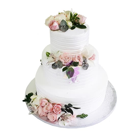 Свадебный торт изготовлен на заказ. Вес такого торта от 5 до 8 кг . Снаружи трехъярусный торт покрыт кремом, без мастики и украшен цветами . Наполнитель может быть с белковым кремом, с кремом на растительных сливках, с масляным кремом, с творожным кремом, с шоколадным кремом, со сливочно-творожным кремом, со сливочным кремом, со сметанным кремом . Белый торт . Коржи могут быть бисквитные, медовые, песочные, шоколадные. Цена от 237 р. Заказать, купить готовый торт на свадьбу по низкой цене в кондитерской Добрый пекарь ☎ + 375 44 700 40 15