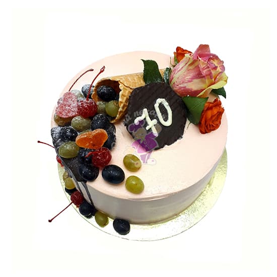 Торт на День Рождения изготовлен на заказ. Вес такого торта от 2 до 4 кг . Снаружи одноярусный торт покрыт кремом, без мастики и украшен цветами, украшен ягодами . Наполнитель может быть с белковым кремом, с кремом на растительных сливках, с масляным кремом, с творожным кремом, с шоколадным кремом, со сливочно-творожным кремом, со сливочным кремом, со сметанным кремом . Коржи могут быть бисквитные, медовые, песочные, шоколадные. Цена от 90 р. Заказать, купить торт на День рождения по низкой цене в кондитерской Добрый пекарь ☎ + 375 44 700 40 15.