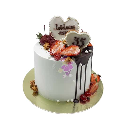 Торт на День Рождения изготовлен на заказ. Вес такого торта от 2 до 4 кг . Снаружи одноярусный торт покрыт кремом, без мастики и украшен пряниками, украшен ягодами, украшен шоколадом . Наполнитель может быть с белковым кремом, с кремом на растительных сливках, с масляным кремом, с творожным кремом, с шоколадным кремом, со сливочно-творожным кремом, со сливочным кремом, со сметанным кремом . Коржи могут быть бисквитные, медовые, песочные, шоколадные. Цена от 82 р. Заказать, купить торт на День рождения по низкой цене в кондитерской Добрый пекарь ☎ + 375 44 700 40 15.